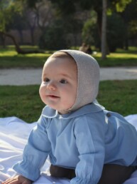 Blusa unisex en color azul con botones de madera que abrochan por la espalda y cuello bebé.