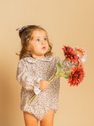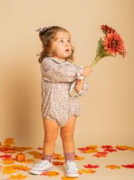 Ranita entera de viyela, ideal para este otoño-invierno en tonos granate, con estampado floral, manga larga y tira bordada en el cuello y final de la manga.